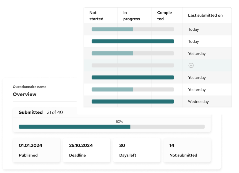 Instantly see how many responses are completed, in progress, or still outstanding. Deadlines and days remaining are clearly visible, helping you stay on schedule and avoid last-minute surprises.