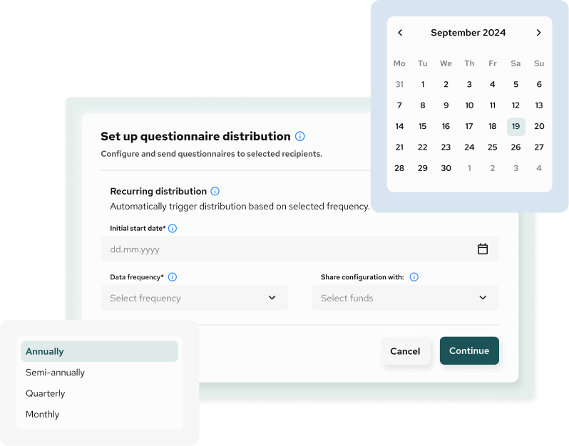 Users can configure distributions based on predefined frequencies such as monthly, quarterly, or annual cycles, and trigger recurring data requests without rebuilding or resending questionnaires manually.