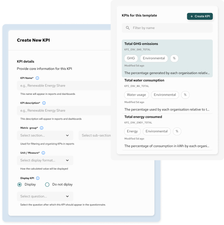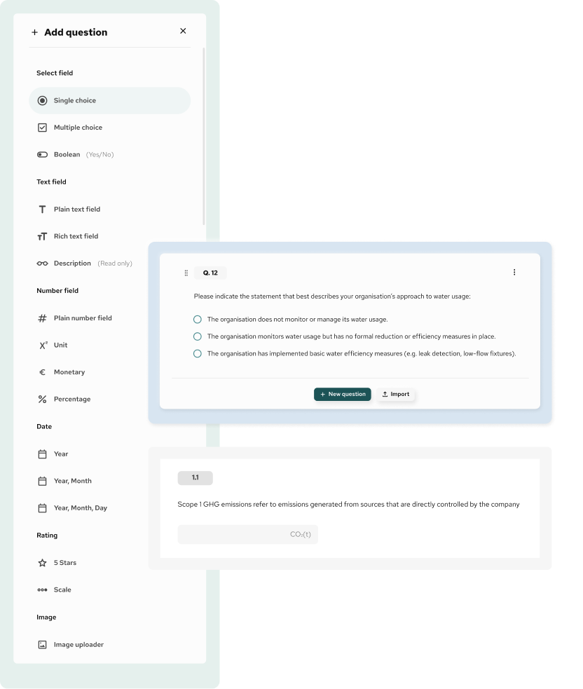 The template builder is a tool that allows you to design structured questionnaires using sections, subsections, and predefined question types. Templates can be reused across teams, entities, and reporting cycles to support consistent and controlled data collection.