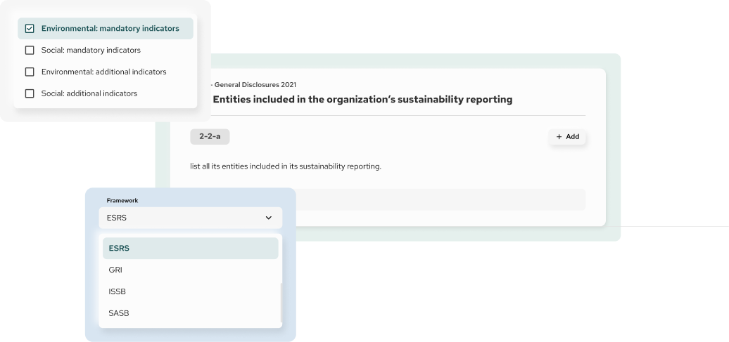 - subsections (e.g. water consumption, supplier screening, internal controls)
