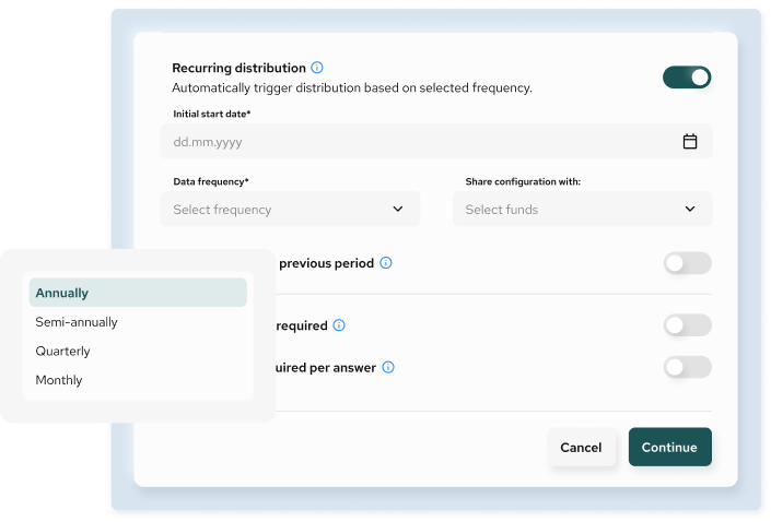 For recurring distributions, you define the start date, reporting frequency (monthly, quarterly, or annual), and automated triggering based on the selected cadence. These settings ensure a controlled, repeatable data-collection process aligned with reporting requirements.
